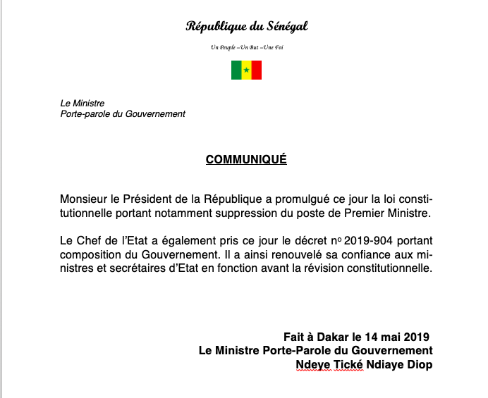 NETTALI.COM - Mahamed Boun Abdallah Dionne n'est plus officiellement le Premier ministre du Sénégal, à compter de ce mardi 14 mai 2019. En effet, le président de la République, Macky Sall a promulgué la loi constitutionnelle portant suppression du poste de Premier Ministre.