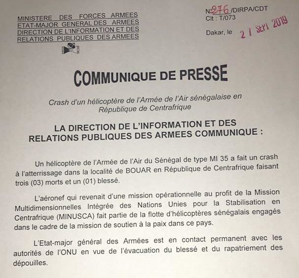 «L’aéronef, qui revenait d’une mission opérationnelle au profit de la Minusca, fait partie de la flotte d’hélicoptères sénégalais engagés dans le cadre de la mission de soutien à la paix dans ce pays. L’Etat-Major général des armées est en contact permanent avec les autorités de l’Onu en vue de l’évacuation du blessé et du rapatriement des dépouilles», informe la Dirpa.