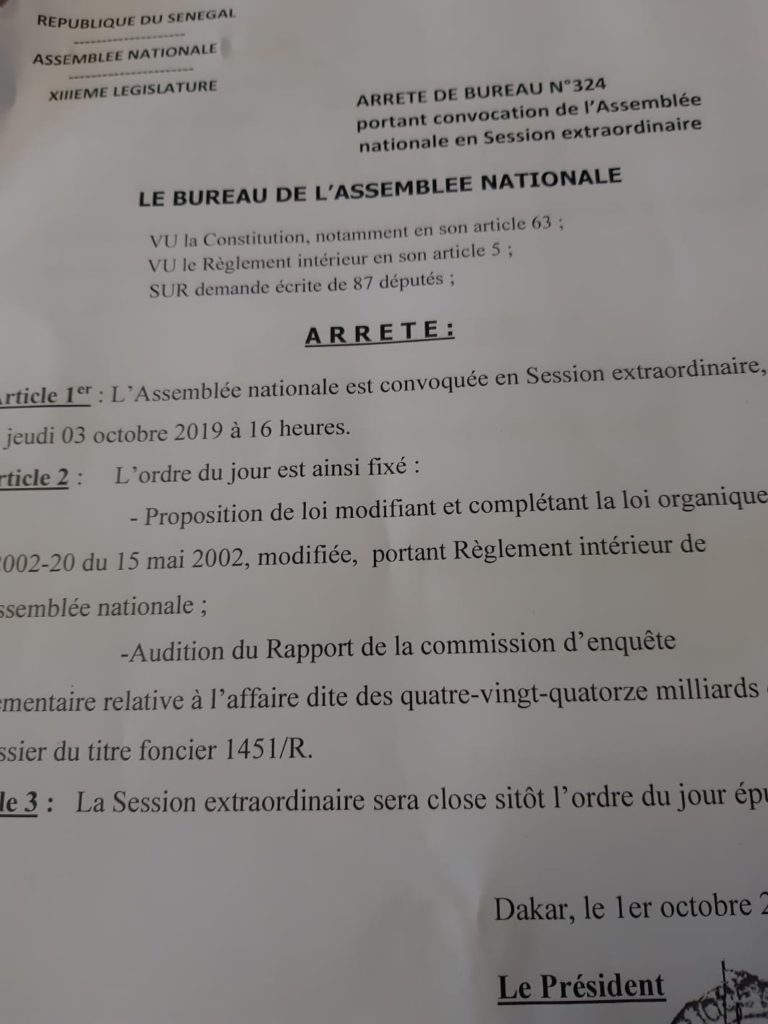 NETTALI.COM - L’Assemblée nationale ouvrira ses portes ce Jeudi 3 octobre 2019. Les députés sont convoqués pour une session extraordinaire à 15 heures. Une session qui va s’ouvrir par l’adoption des nouvelles réformes intervenues dans le règlement intérieur.