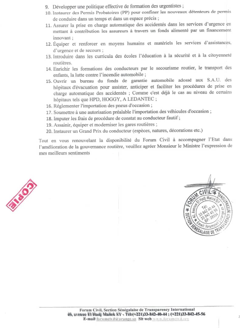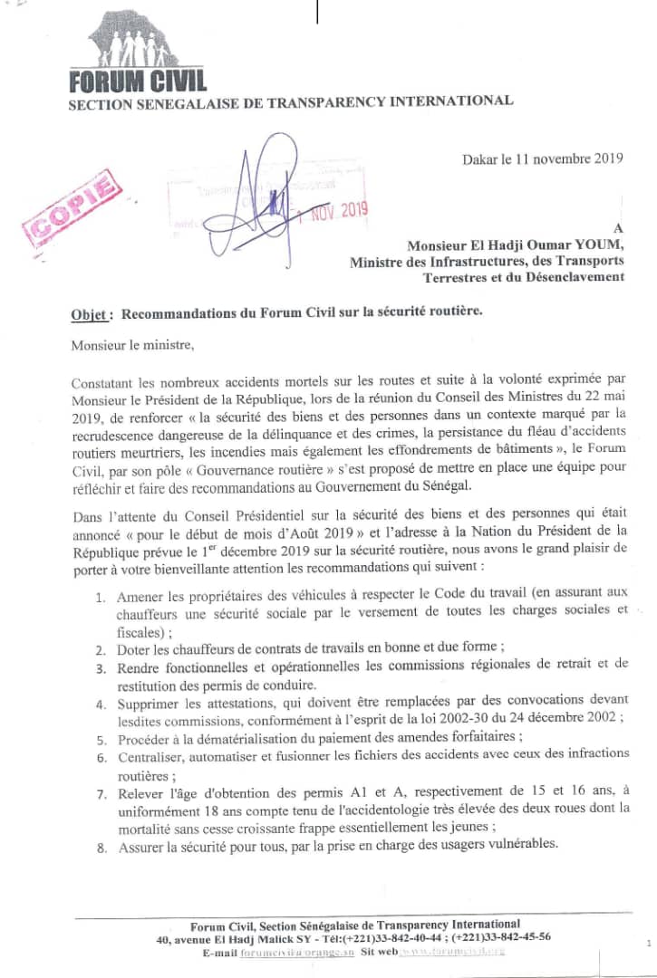 “Constatant les nombreux accidents mortels sur les routes et suite à la volonté exprimée par le Président de la République, lors de la réunion du Conseil des ministres du 22 mai 2019, de renforcer la sécurité des biens et des personnes dans un contexte marqué par la recrudescence dangereuse de la délinquance et des crimes, la persistance du fléau d’accidents routiers meurtriers, les incendies mais également les effondrements de bâtiments, le Forum Civil, par son pôle Gouvernance routière s’est proposé de mettre en place une équipe pour réfléchir et faire des recommandations au gouvernement du Sénégal”, renseignent Birahim Seck et ses camarades dans le document transmis aux services de Me Oumar Youm.