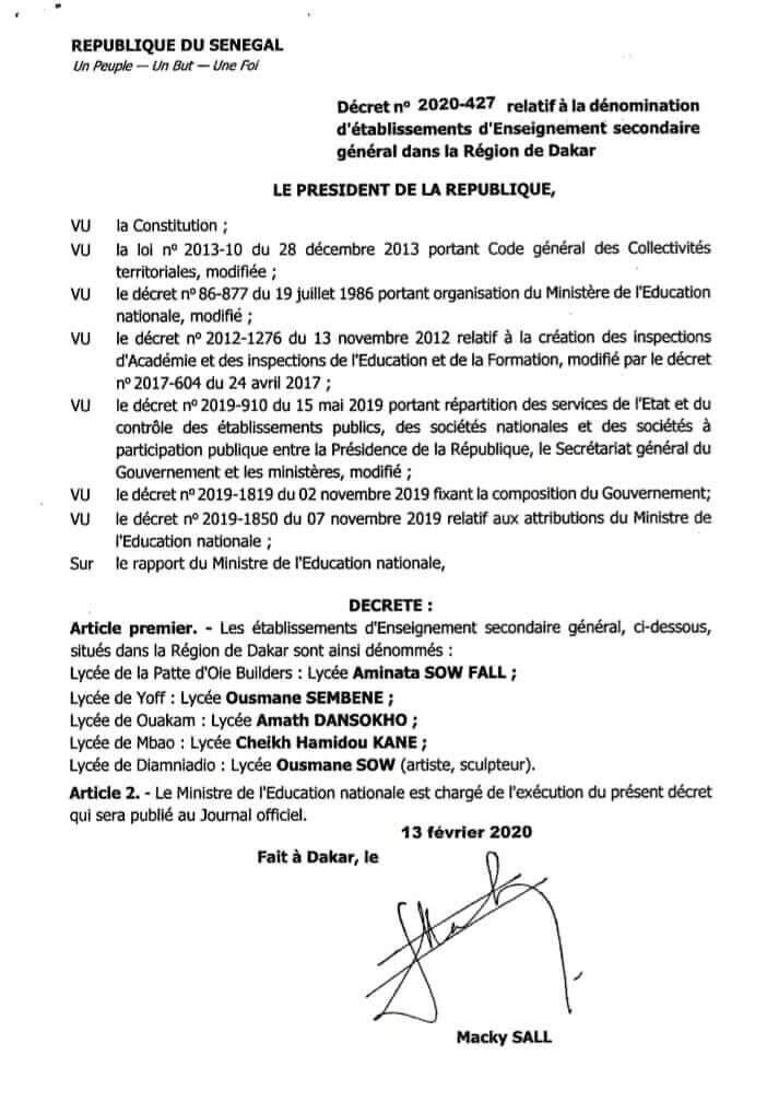 NETTALI.COM - Le président de la République, Macky Sall, a signé le 13 février dernier un décret pour rebaptiser certains lycées de Dakar. C'est ainsi que des établissements d'enseignement secondaire général de la Patte d'oie, de Ouakam, de Mbao, de Yoff et de Diamniadio portent désormais les noms de Aminata Sow Fall, Ousmane Sembène, Amath Dansokho, Cheikh Hamidou Kane et Ousmane Sow (artiste-sculpteur).