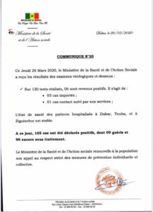 A ce jour, le Sénégal compte 105 cas confirmés de Coronavirus dont 9 guéris et 96 sous traitement.