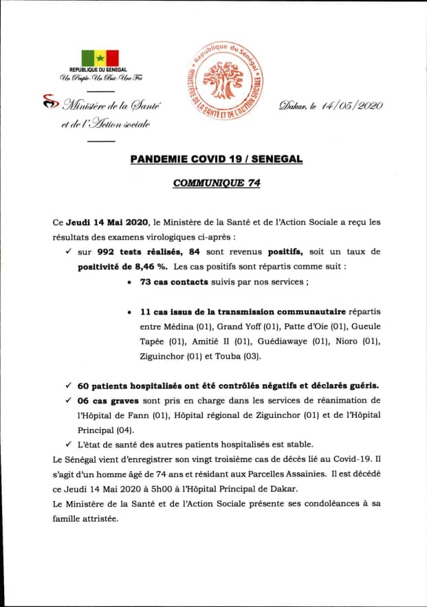 A ce jour, le Sénégal compte 2189 cas confirmés dont 842 guéris, 1323 sous traitement, un cas évacué et vingt-trois décès.