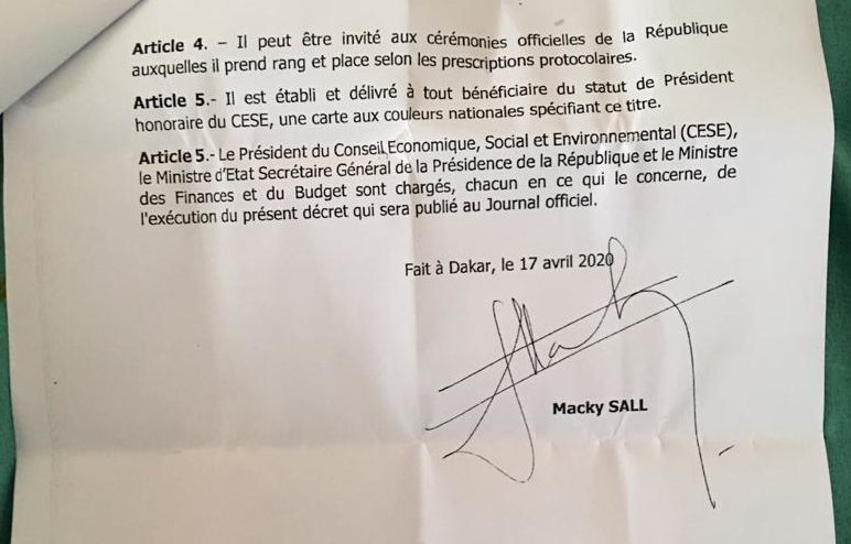 NETTALI.COM - Dans un décret qui serait signé le 17 avril dernier, le président de la République, Macky Sall, aurait institué un honorariat pour les anciens présidents du Conseil économique, social et environnemental (Cese). Une information vite démentie par la présidence de la République. Mais Ousmane Sonko est revenu sur sa page facebook pour dire que ce décret existe bel et bien.