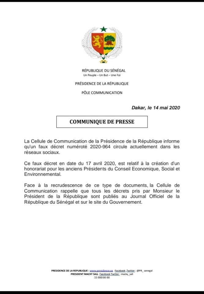 "La Cellule de Communication de la Présidence de la République informe qu'un faux décret numéroté 2020-964 circule actuellement dans les réseaux sociaux. Ce faux décret en date du 17 avril 2020, est relatif à la création d'un honorariat pour les anciens Présidents du Conseil Economique, Social et Environnemental. Face à la recrudescence de ce type de documents, la Cellule de Communication rappelle que tous les décrets pris par Monsieur le Président de la République sont publiés au Journal Officiel de la République du Sénégal et sur le site du Gouvernement", note la Présidence.