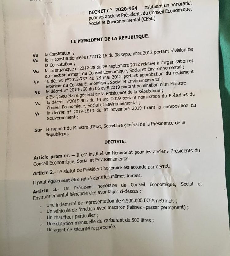 Le décret en question faisait bénéficier aux ancien président du Conseil économique d’"une indemnité de représentation de 4 millions 500 mille FCFA net/mois, un véhicule de fonction avec macro (laissez-passer permanent), un chauffeur particulier, une dotation mensuelle de carburant de 500 litres, et un agent de sécurité rapproché".