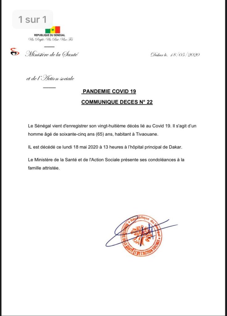 Un peu plutôt dans la journée, c'était une femme âgée de 65 ans qui avait succombé ce lundi 18 mai 2020 à 10h30 à l’hôpital Principal de Dakar.