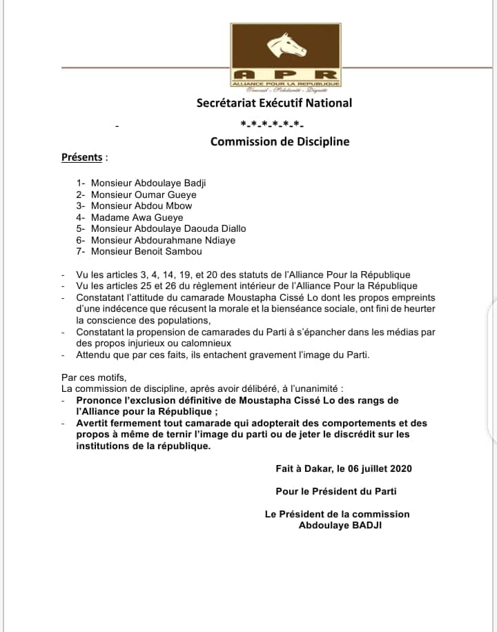 Le conseil de discipline de l’Alliance pour la République (Apr), composé d’Abdoulaye Badji, Oumar Guèye, Abdou Mbow, Awa Guèye, Abdoulaye Daouda Diallo, Abdourahmane Ndiaye et Benoit Sambou, a prononcé ce lundi 6 juillet 2020, l’exclusion de Moustapha Cissé Lô. On lui reproche «des propos empreints d’une indécence que récusent la morale et la bienséance sociale », mais aussi des propos qui ont « heurté la conscience des populations ».