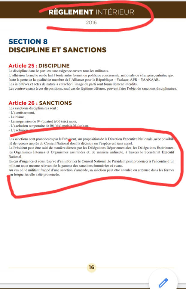 En effet, selon l’article 21 des Statuts de l’Apr, repris par l’art 26 du Règlement intérieur, seul le Président du Parti (Macky Sall en l’occurrence) peut prononcer l’exclusion d’un membre de cette formation politique.