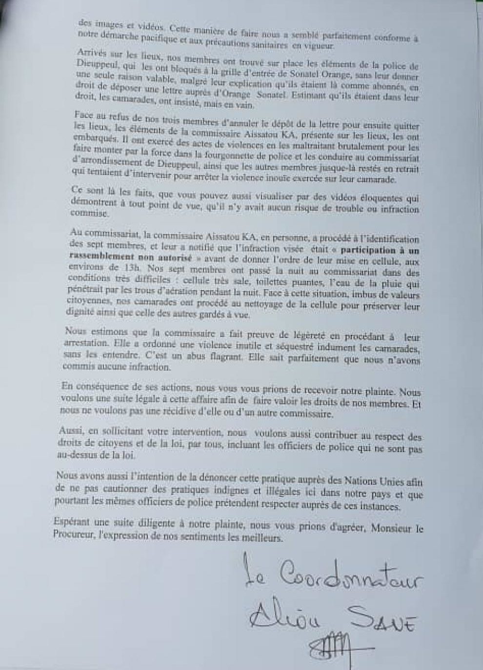 « Nous souhaitons déposer plainte contre la commissaire Aissatou Ka et les agents de police judiciaire qui étaient sous sa commande le mardi 1er septembre devant le siège de la société Sonatel Orange sis sur la VDN pour l’arrestation arbitraire et les actes de violence abusive contre nos camarades, qu’elle a ordonnés, avant de les conduire au commissariat de Dieuppeul, pour les mettre en cellule, les retenir jusqu’au lendemain pour ensuite les relâcher, le matin », lit-on dans la plainte dont nous détenons copie.