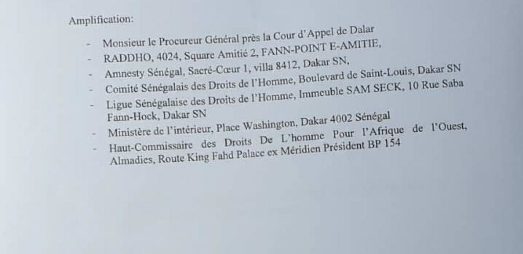 La plainte a été amplifiée au procureur général près la Cour d’appel de Dakar, à toutes les organisations de défense des droits humains, au ministère de l’Intérieur.
