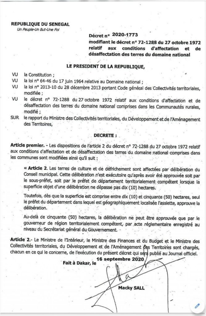 NETTALI.COM - Pour éviter les nombreux problèmes liés à l'affectation des terres, le président de la République, Macky Sall, a pris un décret et a fixé de nouvelles règles.