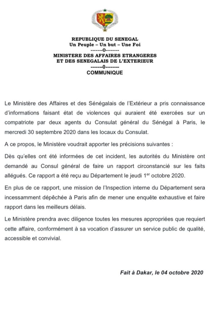 Le ministère des Affaires étrangères et des Sénégalais de l'extérieur, Amadou Bâ, s'est saisi du dossier et a fait ouvrir une enquête. Il a d'ailleurs sorti un communiqué pour rassurer que les responsabilités seront situées.