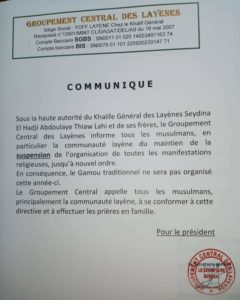 Dans un communiqué parvenu à notre rédaction, le Groupement central des Layènes, sous la haute autorité du khalife général, Seydina El Hadji Abdoulaye Thiaw Laye, informe du maintien de la suspension de l’organisation de toutes les manifestations religieuses, jusqu’à nouvel ordre.