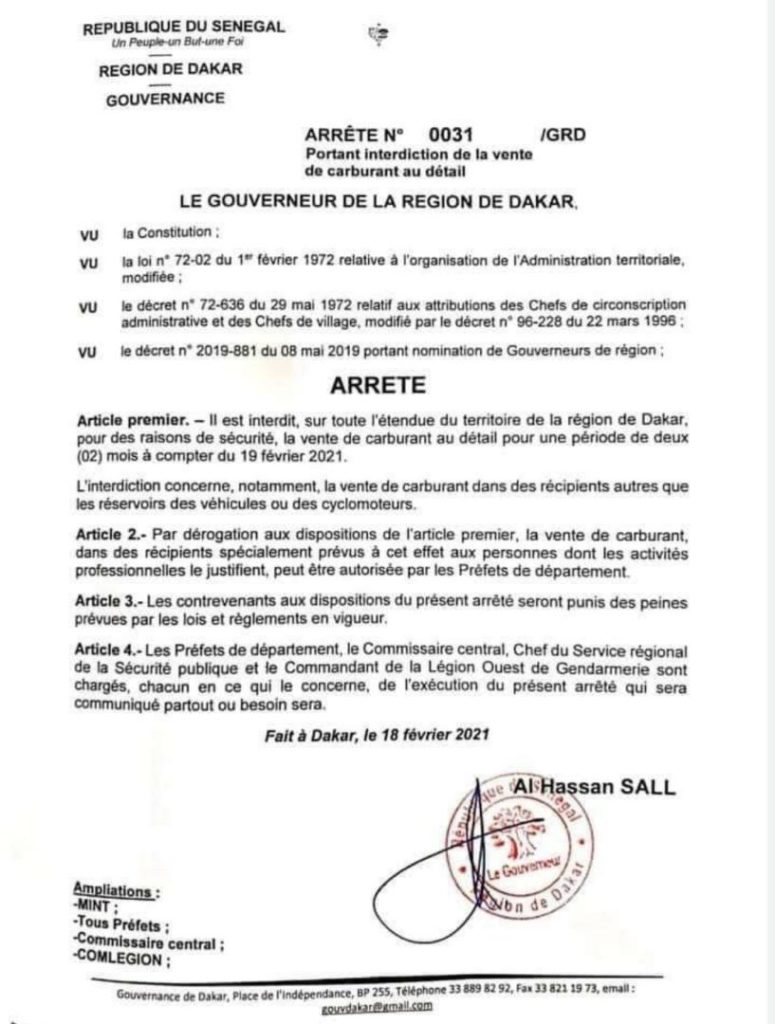 "ll est interdit, sur toute l'étendue du territoire de la région de Dakar, pour des raisons de sécurité, la vente de carburant au détail pour une période de deux (02) mois à compter du 19 février 2021", informe l’arrêté dans son article premier. Le document précise que l'interdiction concerne, notamment, la vente de carburant dans des récipients autres que les réservoirs des véhicules ou des cyclomoteurs.