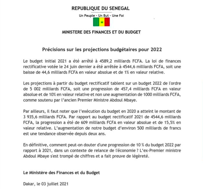 "Le budget initial 2021 a été arrêté à 4589,2 milliards FCFA. La loi de finances rectificative votée le 24 juin dernier a été arrêtée à 4544,6 milliards FCFA, soit une baisse de 44,6 milliards FCFA en valeur absolue et de 1% en valeur relative. Les projections à partir du budget rectificatif tablent sur un budget 2022 de l'ordre de 5 002 milliards FCFA, soit une progression de 457,4 milliards FCFA en valeur absolue et de 10% en valeur relative et non une augmentation de 1000 milliards FCFA, comme soutenu par l’ancien Premier Ministre Abdoul Mbaye", a réagi le ministère des Finances.