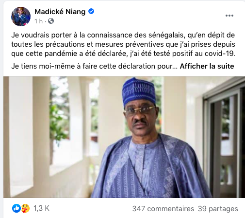 "Je voudrais porter à la connaissance des sénégalais, qu’en dépit de toutes les précautions et mesures préventives que j’ai prises depuis que cette pandémie a été déclarée, j’ai été testé positif au covid-19.