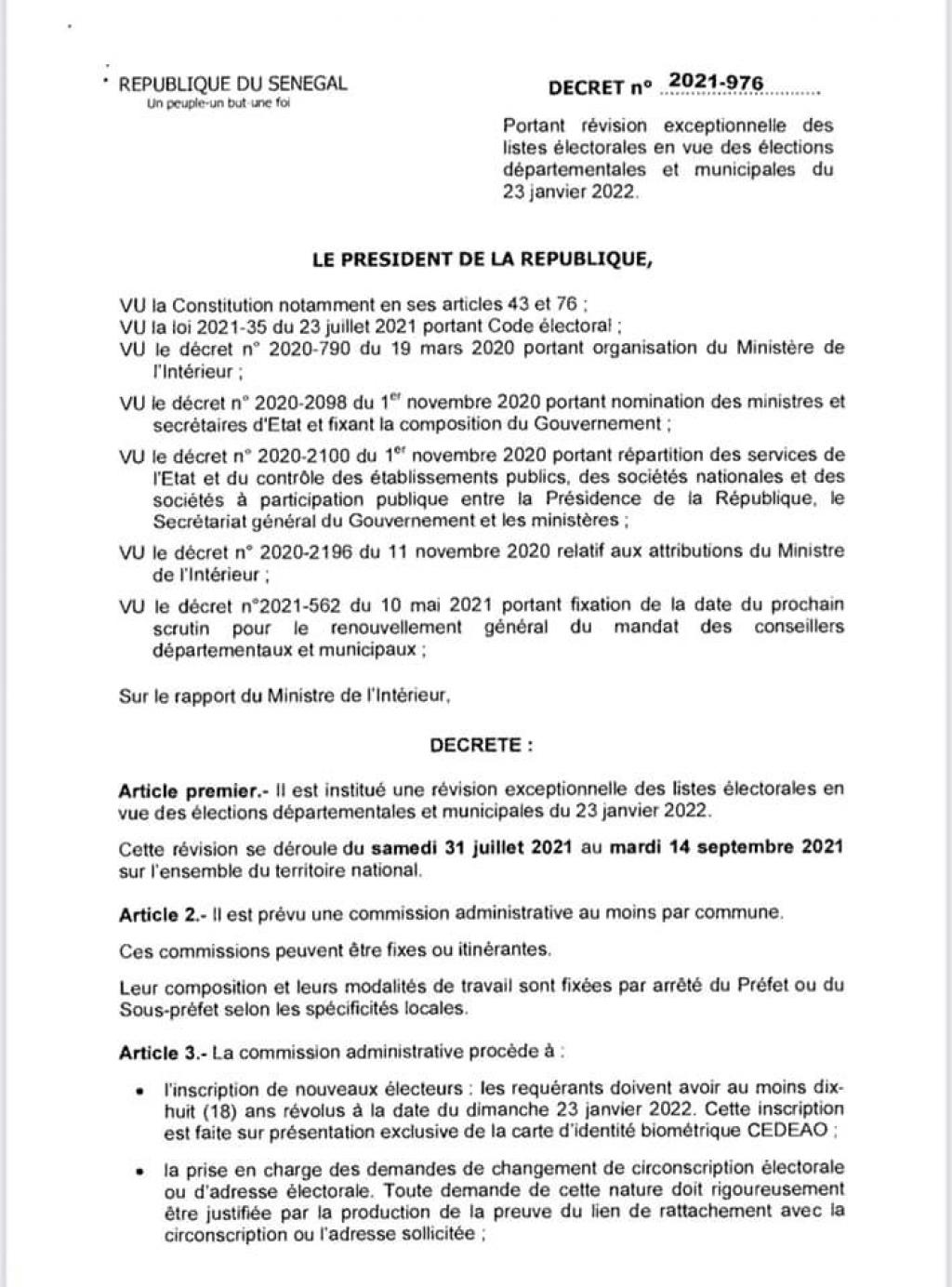 NETTALI.COM - Le président de la République, Macky Sall, a finalement pris un décret portant révision exceptionnelle des listes électorales en vue des élections départementales et municipales du 23 janvier 2022. Selon le décret, la révision démarre le samedi 31 juillet et se termine le mardi 14 septembre prochain.