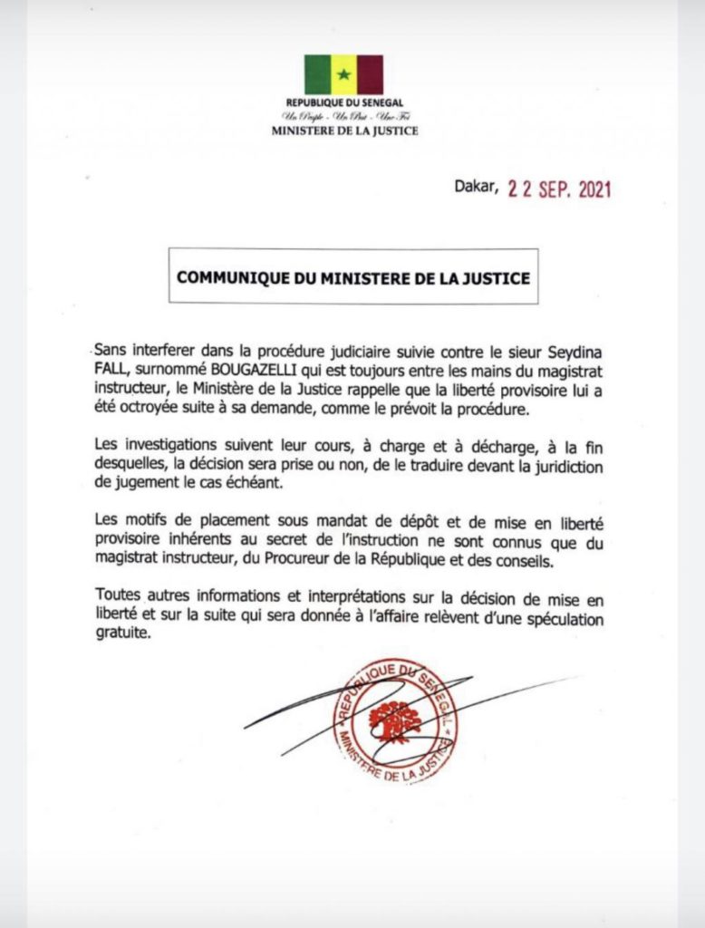 "Sans interférer dans la procédure judiciaire suivie contre le sieur Seydina Fall, surnommé Bougazelli qui est toujours entre les mains du magistrat instructeur, le Ministère de la Justice rappelle que la liberté provisoire lui a été octroyée suite à sa demande, comme le prévoit la procédure. Les investigations suivent leur cours, à charge et à décharge, à la fin desquelles, la décision sera prise ou non, de le traduire devant la juridiction de jugement le cas échéant", indique le département ministériel de Me Malick Sall.
