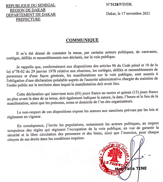 NETTALI.COM - Le Préfet de Dakar, Mor Talla Tine, a sorti un communiqué, suite à l'interpellation de Barthélémy Dias par les forces de l'ordre, pour rappeler qu'aucune manifestation ne peut être organisée sur la voie publique sans une autorisation préalable. Tout contrevenant à cette disposition légale s'expose à des sanctions pénales prévues par le Code pénal Sénégalais.