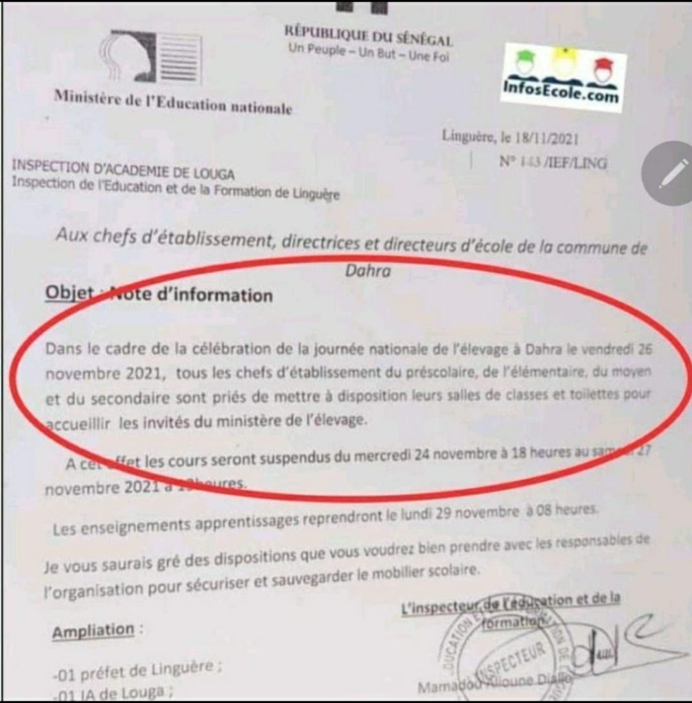 NETTALI.COM- La suspension des cours, pour trois jours, pour les élèves des 14 écoles sur les 21 que compte Dahra Djolof, à cause de la journée de l’élevage, n’est pas du goût de la Cosydep locale. La coalition nationale sénégalaise pour la défense de l'éducation regrette cette mesure.