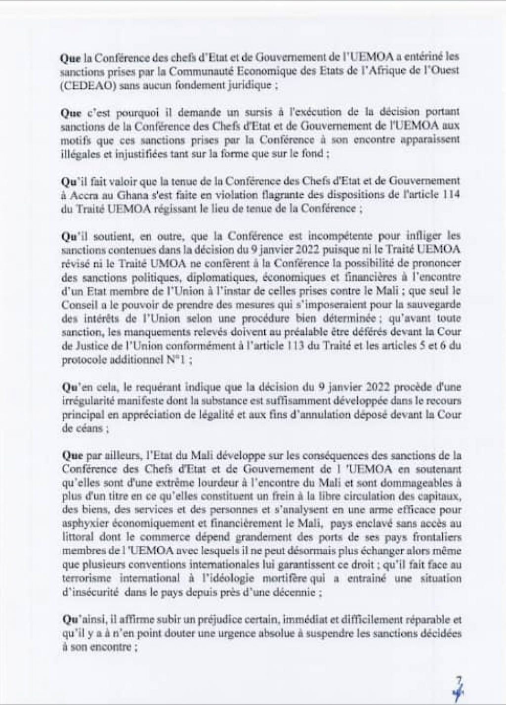 Bamako a notamment fait valoir que les textes de la Banque centrale des États de l’Afrique de l’Ouest (BCEAO) prévoient qu’elle ne peut solliciter ni recevoir de directives ou d’instructions des institutions ou organes communautaires, des gouvernements des États membres de l’Uemoa, de tout autre organisme ou de toute autre personne. Elle ne peut donc être utilisée pour asphyxier un État membre.