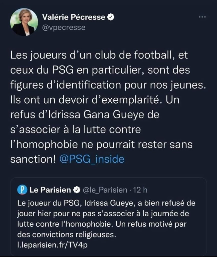 «Les joueurs d’un club de football, et ceux du PSG en particulier, sont des figures d’identification pour nos jeunes. Ils ont un devoir d’exemplarité. Un refus d’Idrissa Gana Gueye de s’associer à la lutte contre l’homophobie ne pourrait rester sans sanction!», a publié Valérie Pécresse sur sa page Facebook.