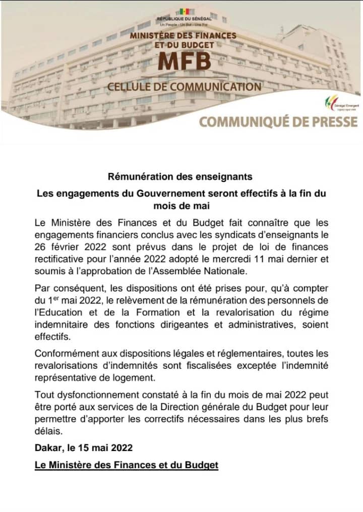 Le ministère du Budget informe que ces engagements financiers conclus avec les syndicats d’enseignants le 26 février 2022 sont prévus dans le projet de loi de finances rectificative pour l’année 2022 adopté le mercredi 11 mai dernier et soumis à l’approbation de l’Assemblée Nationale.