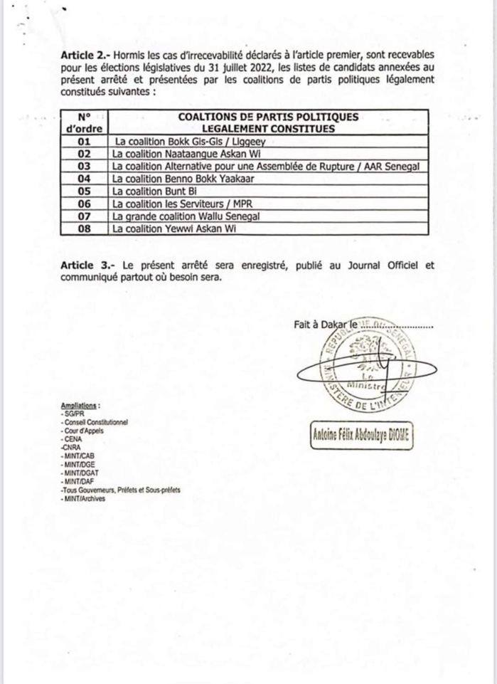 NETTALI.COM - L'information vient de tomber. La Direction générale des élections (Dge) a déclaré irrecevable la liste nationale titulaire de Yewwi Askan Wi. Elle a, dans le même temps, déclaré irrecevable la liste des suppléants de Benno Bokk Yaakaar.