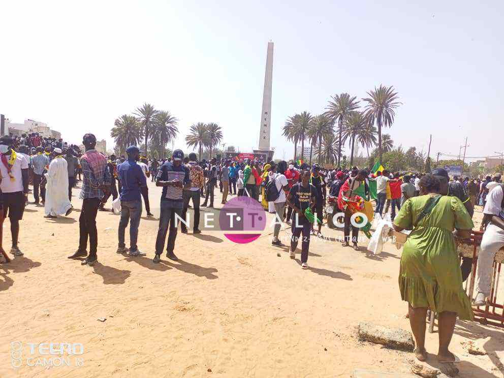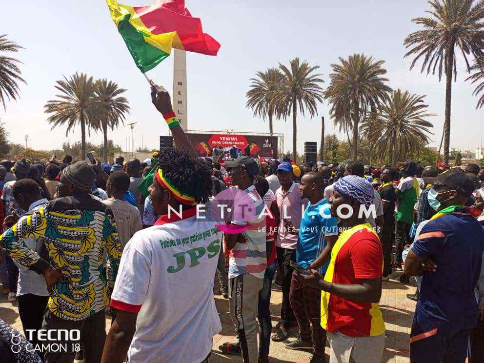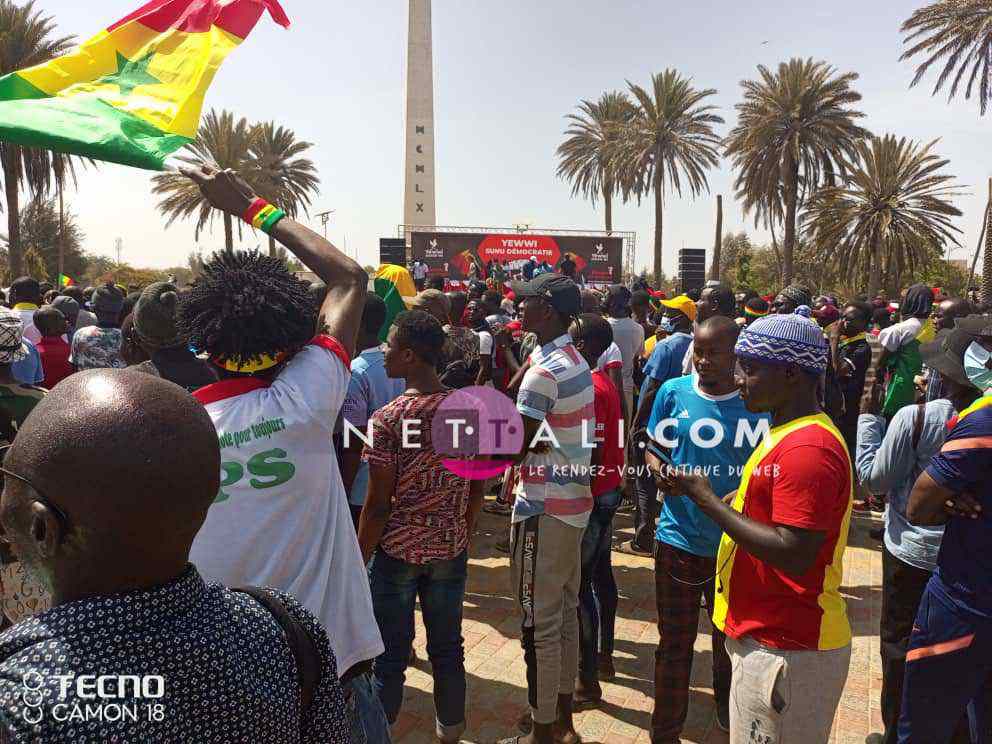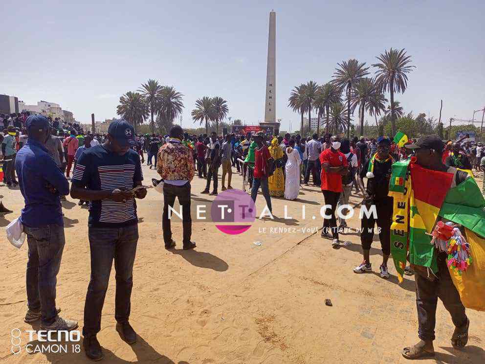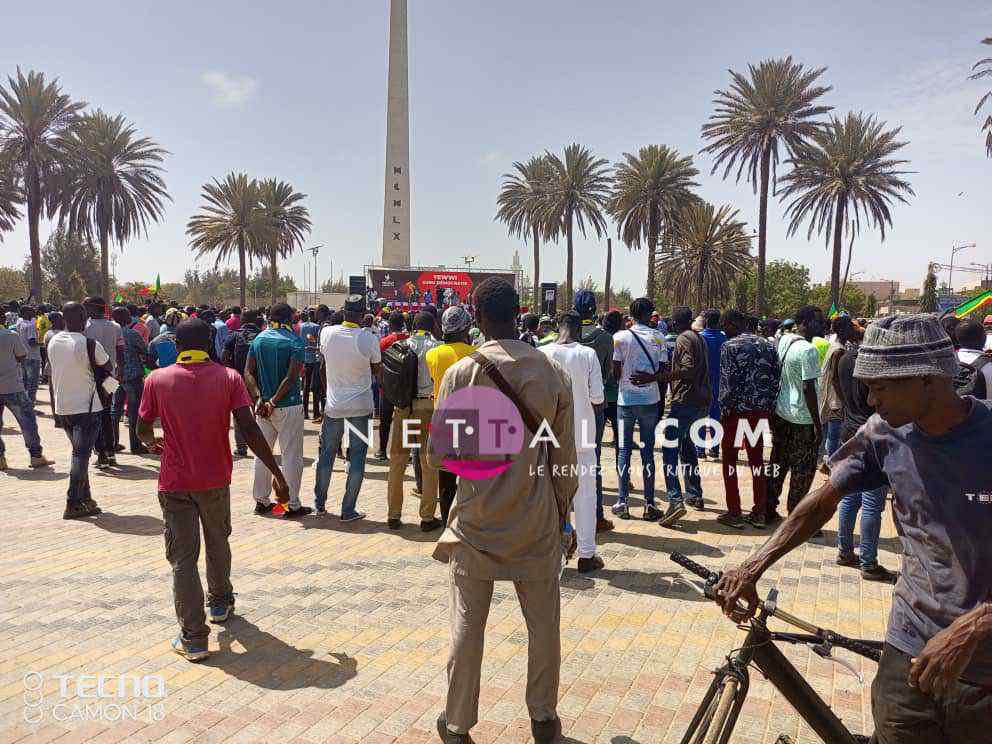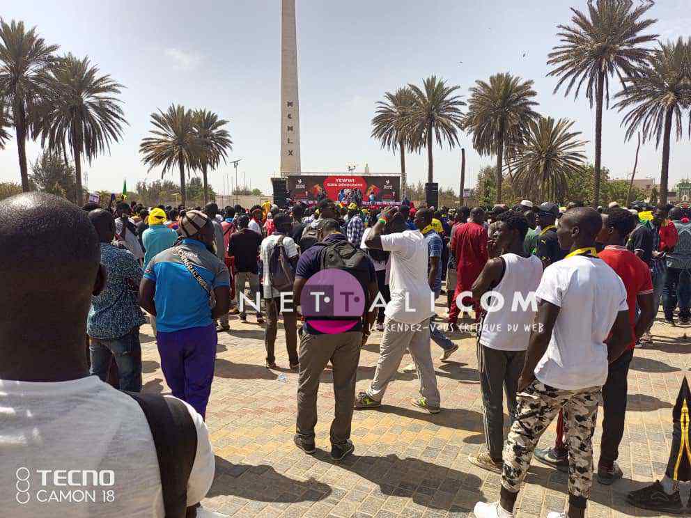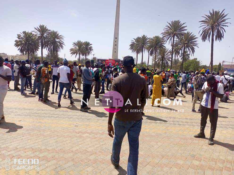 NETTALI.COM - Ce mercredi 8 juin, la Place de l'Obélisque où a lieu la manifestation de Yewwi Askan Wi Wallu, suite au rejet de sa liste de titulaires au ndu scrutin national, été prise d'assaut avant même l'heure de début prévue à 15 heures. Voici les 1ères images de la manifestation avec les arrivées d'Ahmeth Aidara et de Queen Biz, les 1ères célébrités à être aperçues sur la place. Une place qui commence d'ailleurs à refuser du monde avec une foule qui est en train de se masser.