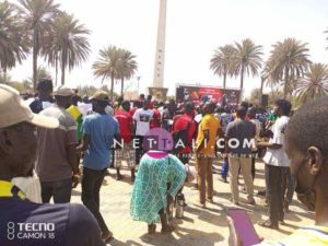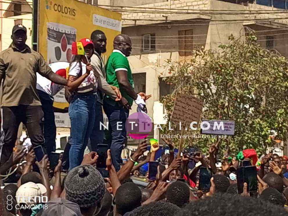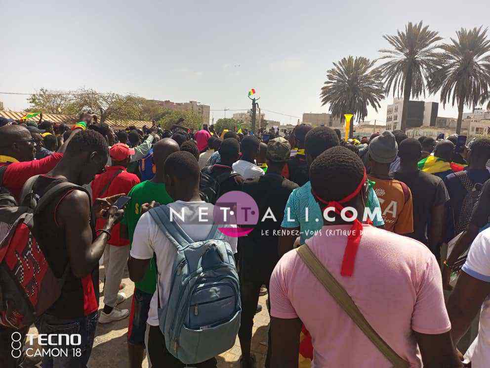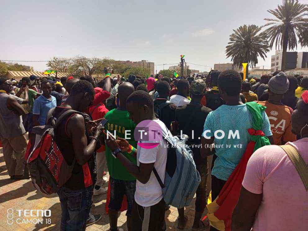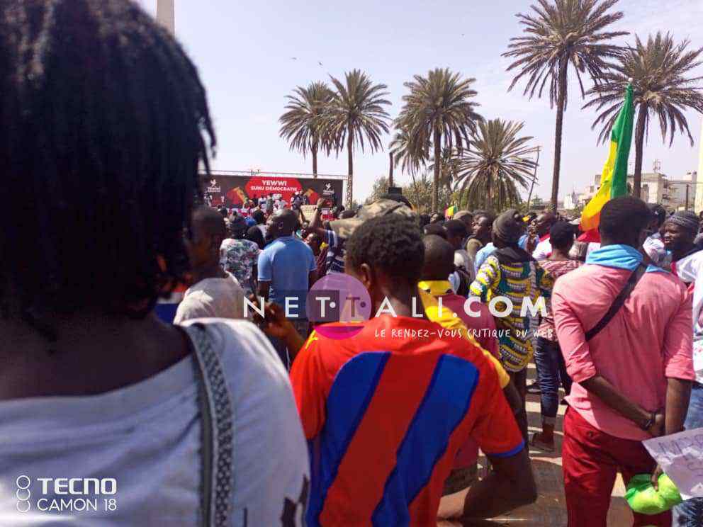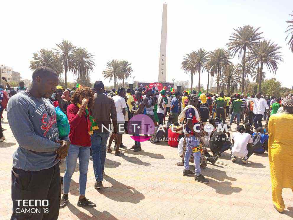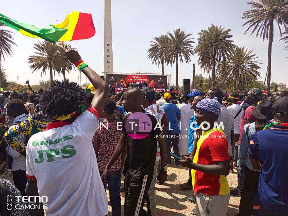 NETTALI.COM - Ce mercredi 8 juin, la Place de l'Obélisque où a lieu la manifestation de Yewwi Askan Wi Wallu, suite au rejet de sa liste de titulaires au ndu scrutin national, été prise d'assaut avant même l'heure de début prévue à 15 heures. Voici les 1ères images de la manifestation avec les arrivées d'Ahmeth Aidara et de Queen Biz, les 1ères célébrités à être aperçues sur la place. Une place qui commence d'ailleurs à refuser du monde avec une foule qui est en train de se masser.