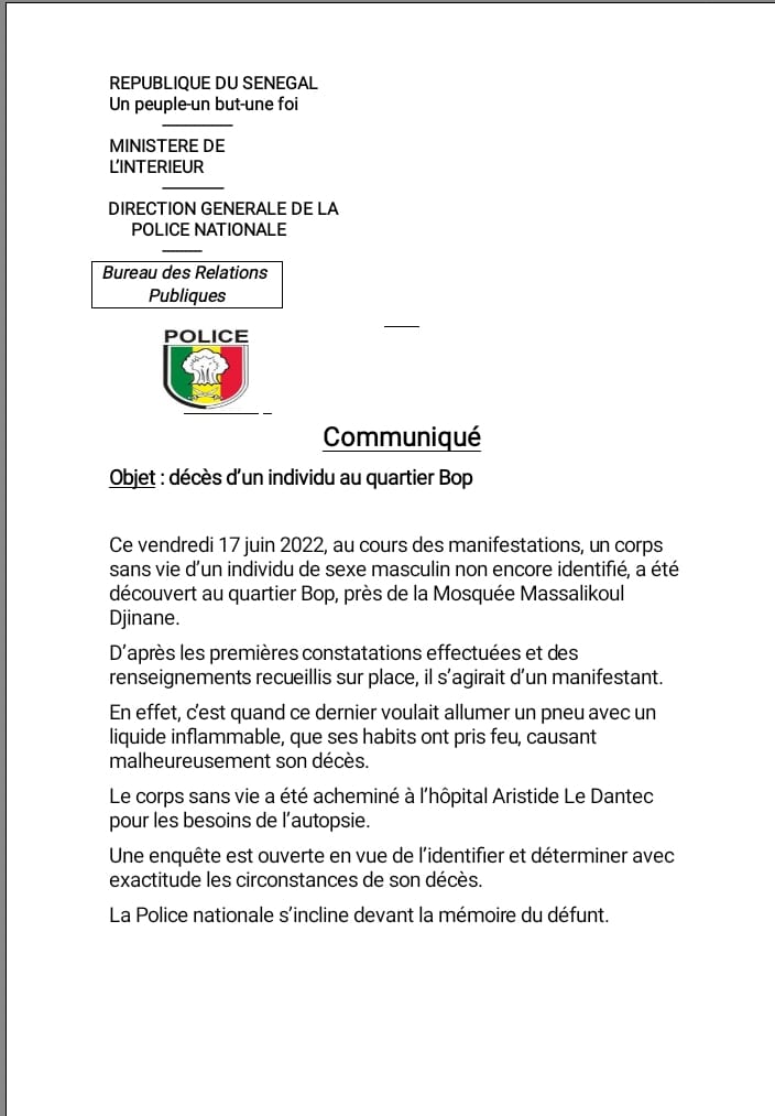 NETTALI.COM - Alors que la plupart des gens impute la responsabilité de la mort d'un jeune manifestant à Colobane aux forces de défense et de sécurité, la police a sorti un communiqué pour expliquer que la vérité est que c'est une mauvaise manipulation d'un liquide inflammable qui a causé la mort de cette personne dont l'identité n'est pas encore connue.