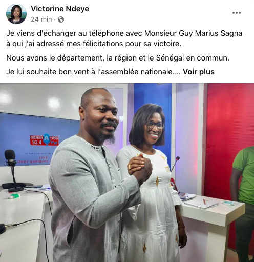 "Je viens d'échanger au téléphone avec Monsieur Guy Marius Sagna à qui j'ai adressé mes félicitations pour sa victoire. Nous avons le département, la région et le Sénégal en commun", écrit la tête de liste de BBY à Ziguinchor, sur sa page Facebook.