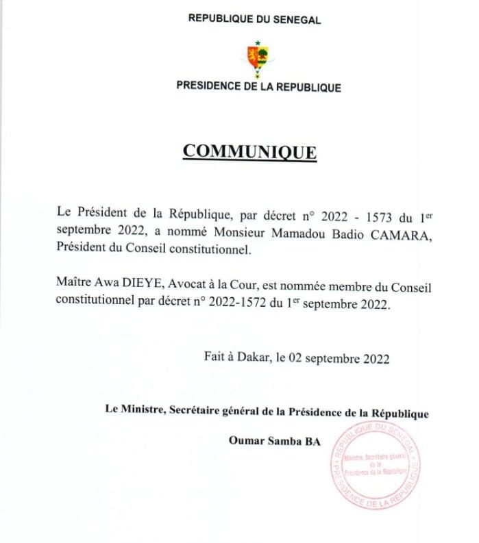 Mamadou Badio Camara est le nouveau président du Conseil constitutionnel. D'après un communiqué signé par le ministre, secrétaire général de la présidence de la République, le chef de l’Etat a pris la décision dans un décret daté du 02 septembre 2022 et portant le numéro 2022 - 1573. La même source annonce également la nomination de Me Awa Dièye, avocat à la cour comme membre du Conseil constitutionnel.