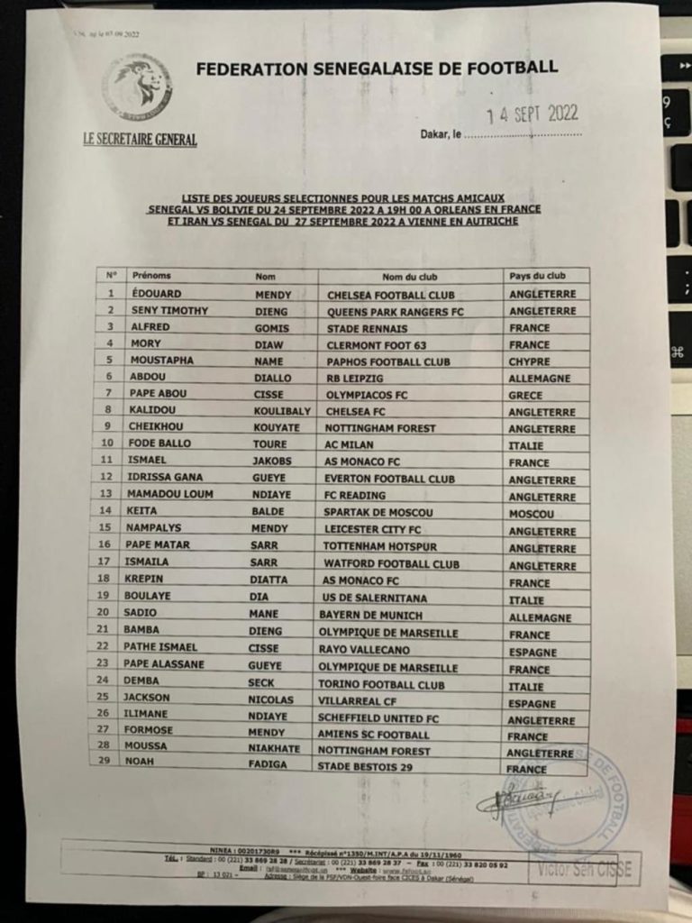 NETTALI.COM - Le sélectionneur national, Aliou Cissé, a publié ce vendredi la liste des 29 joueurs retenus pour les deux matchs amicaux contre la Bolivie (24 septembre) et l'Iran (27 septembre). Noah Fadiga, le fils de Fadiga, Mory Diaw, Pathé Ciss, Jackson Nicolas, Moussa Niakhaté et Ismael Jakobs sont les six nouveaux appelés dans la tanière. On note également le grand retour de Formose Mendy et de Krépin Diatta ainsi que l'absence de Saliou Ciss qui est, pour le moment, sans club.