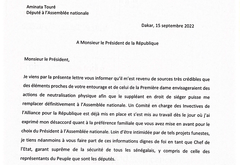 «Je viens par la présente lettre vous informer qu'il m'est revenu de sources très crédibles que des éléments proches de votre entourage et de celui de la Première dame, envisageraient des actions de neutralisation physique afin que le suppléant en droit de siéger puisse me remplacer définitivement à l'Assemblée nationale", écrit Mimi.