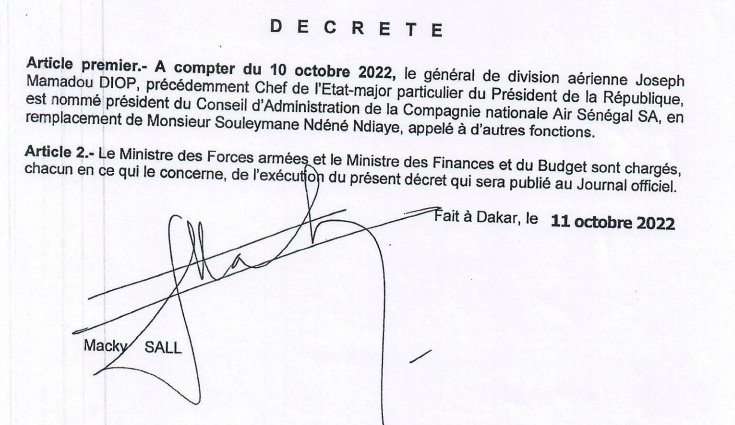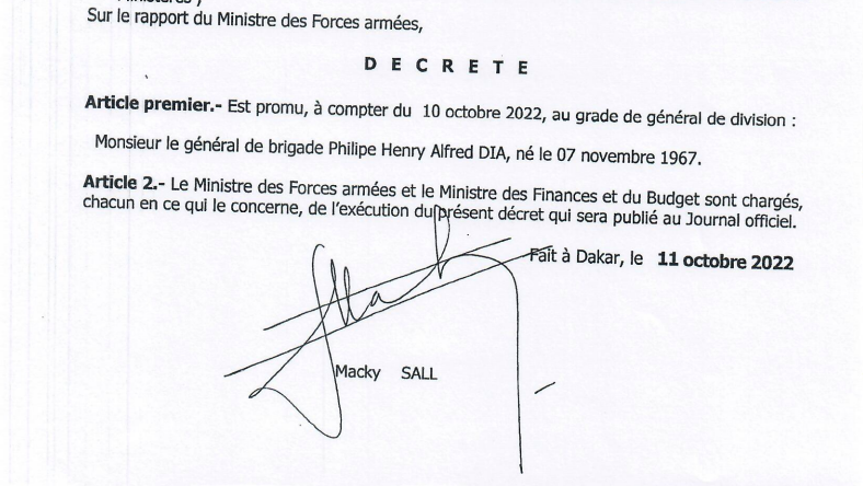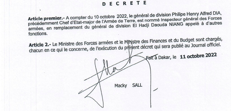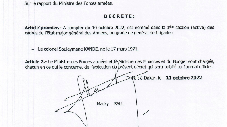 C'est le général de brigade Mbaye Cissé, jusqu'ici directeur du Centre des hautes Etudes de défense et de Sécurité et promu général de division qui devient le chef de l'Etat-Major particulier du président de la république, là où Souleymane Kandé précédemment commandant des opérations spéciales est nommé Chef d'Etat-major de l'Armée de terre.