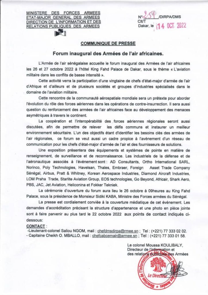 NETTALI.COM- Le Sénégal va accueillir du 26 au 27 octobre 2022, le forum inaugural des Armées de l’air Africaines, indique un communiqué de la Direction de l’information et des relations publiques des Armées (Dirpa).
