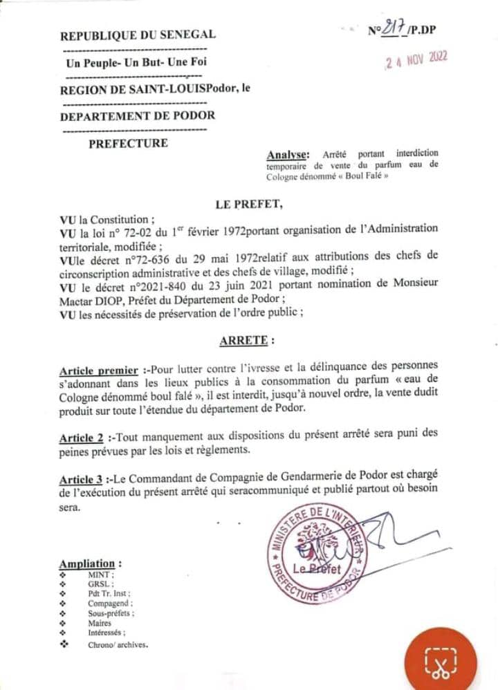 Ce jeudi, le préfet de Podor a sorti un arrêté pour interdire la vente de l’eau de Cologne dénommé ‘’Boul Falé’’. Une décision prise pour ‘’lutter contre l’ivresse et la délinquance des personnes s’adonnant dans les lieux publics à la consommation du parfum ‘’eau de Cologne dénommé ‘Boul falé’’’. Il est interdit, jusqu’à nouvel ordre, la vente dudit produit sur toute l’étendue du département de Podor. Tout manquement aux dispositions du présent arrêté sera puni des peines prévues par les lois et règlements’’, écrit le préfet.