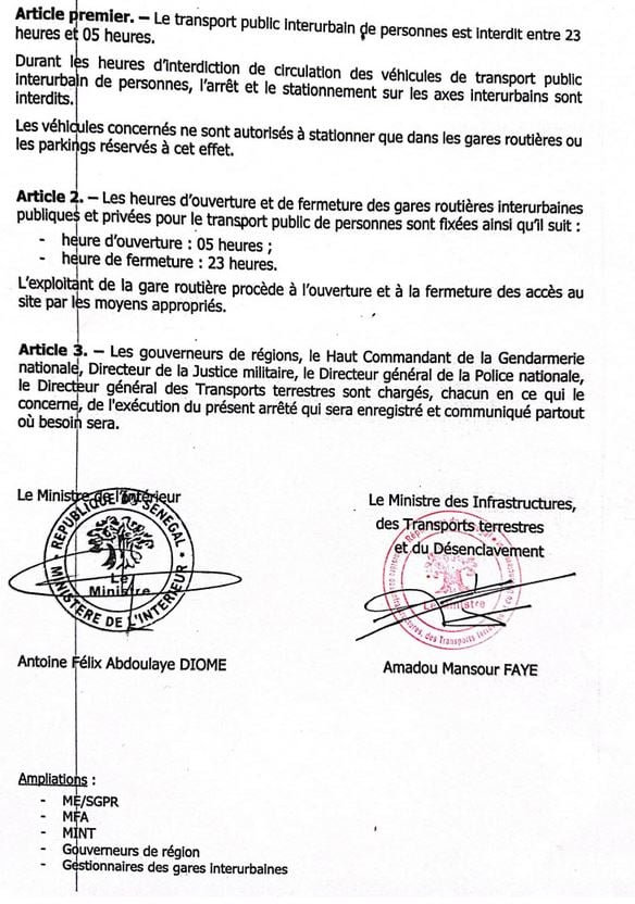 Mansour Faye, le ministre des infrastructures et des transports terrestres et le ministre de l'Intérieur, Antoine Felix Diome ont signé un arrêté interdisant le transport interurbain en commun de 23 heures à 5 heures du matin. Durant les heures d'interdiction de circulation des véhicules de transport public interurbain de personnes, l'arrêt et le stationnement sur les axes interurbains sont interdits.