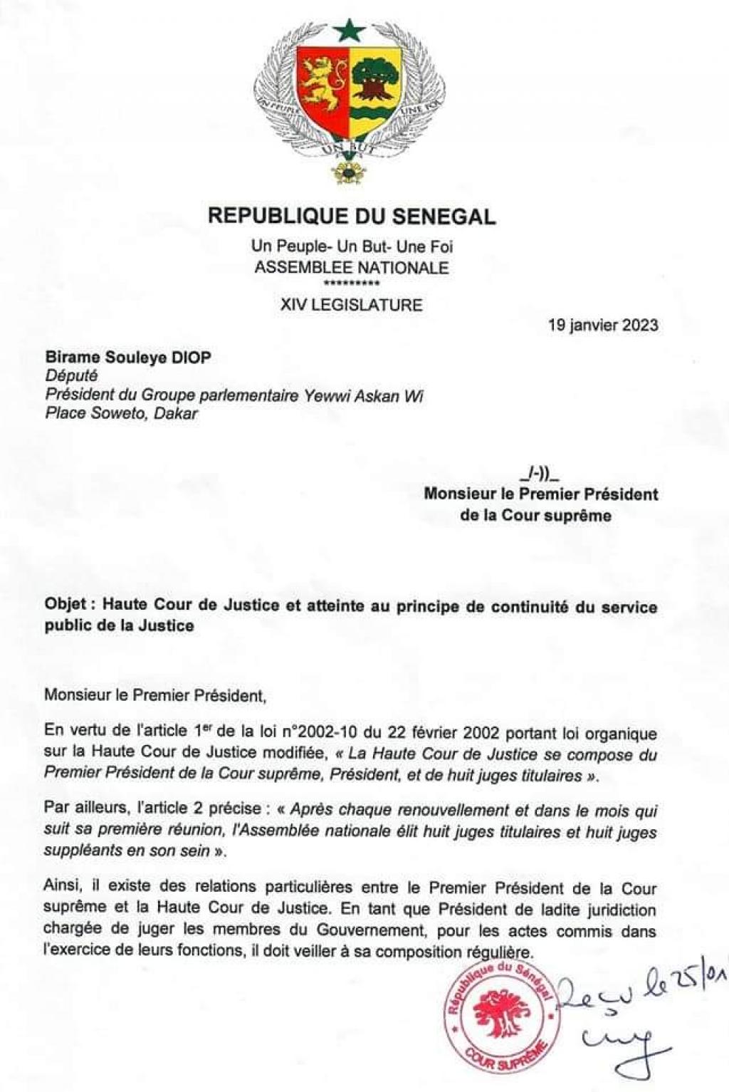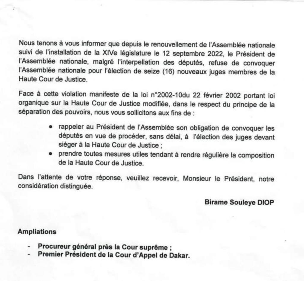 «Nous tenons à vous informer que depuis le renouvellement de l'Assemblée nationale suivi de l'installation de la XIVe législature le 12 septembre 2022, le Président de l'Assemblée nationale, malgré l'interpellation des députés, refuse de convoquer l'Assemblée nationale pour l'élection de seize (16) nouveaux juges membres de la Haute Cour de Justice», a déclaré le député Birame Soulèye Diop dans sa correspondance envoyée au premier président de la Cour suprême.