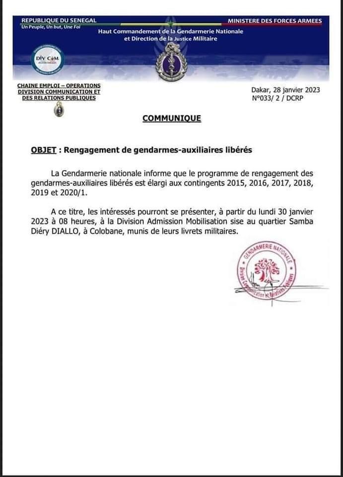 Un communiqué rendu public ce samedi renseigne que la gendarmerie élargit ce rengagement aux auxiliaires des promotions de 2015, 2016 et 2017. Ceux qui sont intéressés sont invités à se présenter à partir du lundi 30 janvier 2023 à la Division admission-mobilisation sise au quartier Samba Diéry Diallo de Colobane munis de leur livrets militaires;