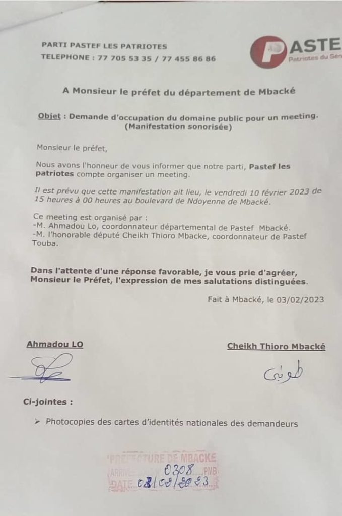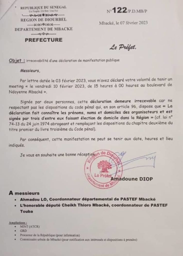 "Par lettre datée le 03 février 2023, vous avez déclaré votre volonté de tenir un meeting le vendredi 10 février 2023, de 15 heures à 00 heures au boulevard de Ndoyenne Mbacké signée par deux personnes, cette déclaration demeure irrecevable car ne respectant pas les dispositions du code pénal qui en son article 96, dispose que la déclaration fait connaître les prénoms, noms et domiciles des organisateurs et est signée par trois d'entre eux faisant élection de domicile dans la Région (cf. loi n° 74-13 du 24 juin 1974 abrogeant et remplaçant les dispositions du chapitre deuxième du titre premier du livre troisième du Code pénal. Par conséquent, cette manifestation ne peut se tenir aux date, heures et lieu Indiqués", lit-on dans le document signé par le préfet.