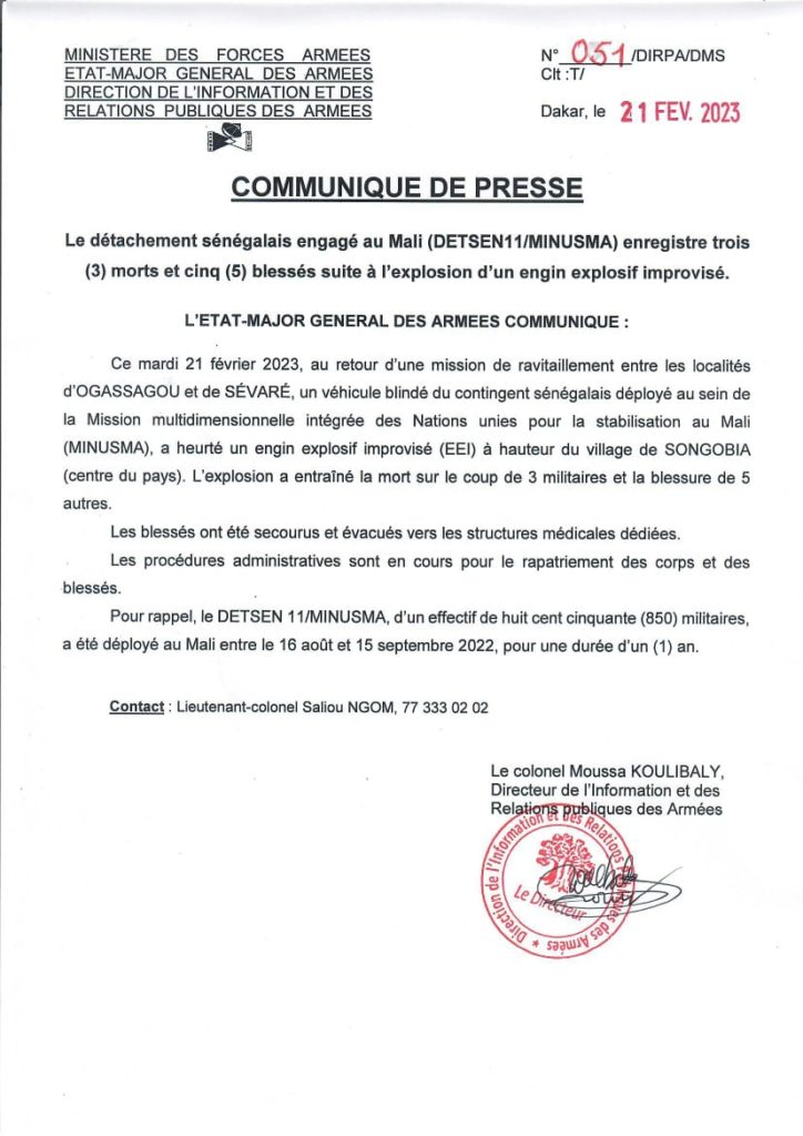 NETTALI.COM - Trois casques bleus de la mission de l'Onu au Mali sont morts et cinq autres blessés ce mardi après l'explosion d'une bombe artisanale dans le centre du pays, a indiqué la Minusma. La Direction de l’information et des relations publiques des armées (Dirpa) informe que les victimes sont des militaires Sénégalais.