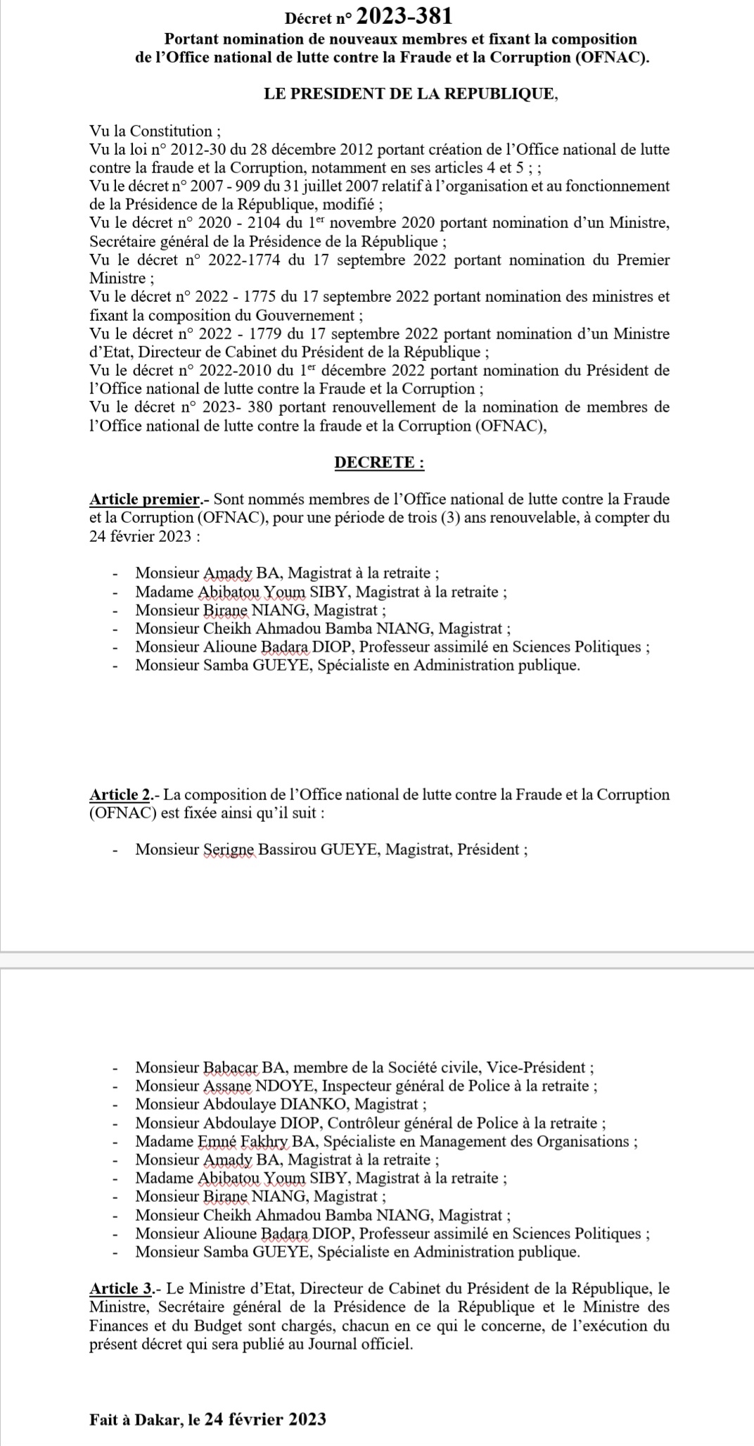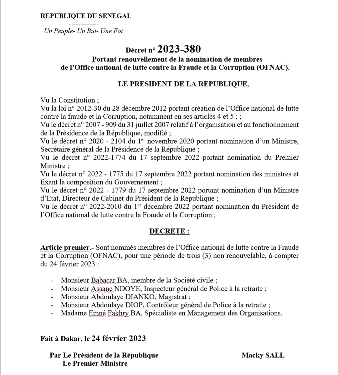 NETTALI.COM - Le président de la République, Macky Sall, a nommé ce vendredi de nouveau membres pour seconder Bassirou Guèye à l’Office national de lutte contre la fraude et la corruption(OFNAC). Il a signé les décrets N° 2023-380 et N° 2023-381 du 24 février 2023 portant nomination des nouveaux membres de la même entité. Ce renouvellement sera pour trois ans à partir de ce 24 février, date à laquelle le présent décret est rendu public. Certains des membres concernés par le décret étaient déjà membre de l'Ofnac. Leur mandat a juste été renouvelé.