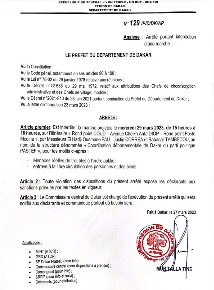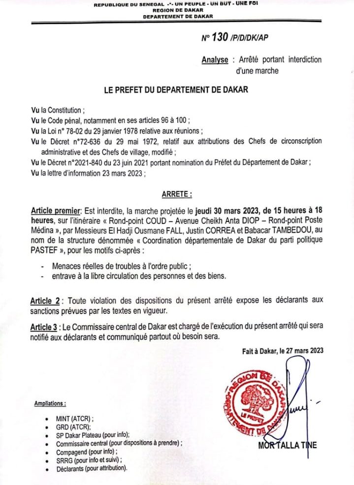 NETTALI.COM - Le Préfet de Dakar a interdit les marches que la coalition «Yewi Askan Wi» projetait d’organiser les 29 et 30 mars prochain. Mor Tall Tine a pris deux arrêtés d’interdiction et l’a signifié aux responsables de Pastef qui avait déposé la demande.