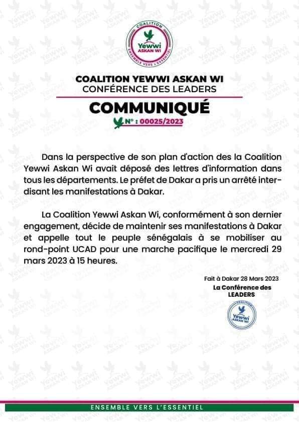 «La Coalition Yewwi Askan Wi, conformément à son dernier engagement, décide de maintenir ses manifestations à Dakar», lit-on dans son communiqué de presse. Les opposants appellent tout le peuple sénégalais à se mobiliser au rond-point Ucad pour une marche pacifique le mercredi 29 mars 2023 à 15 heures.