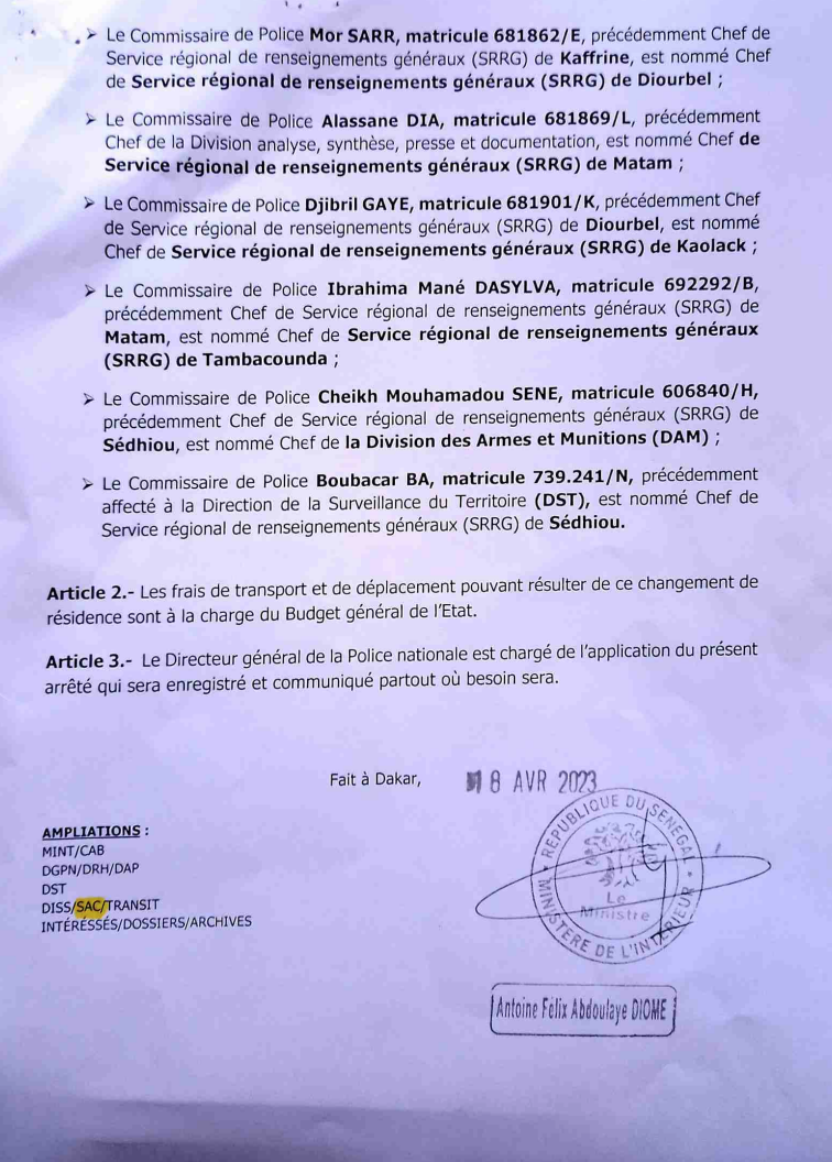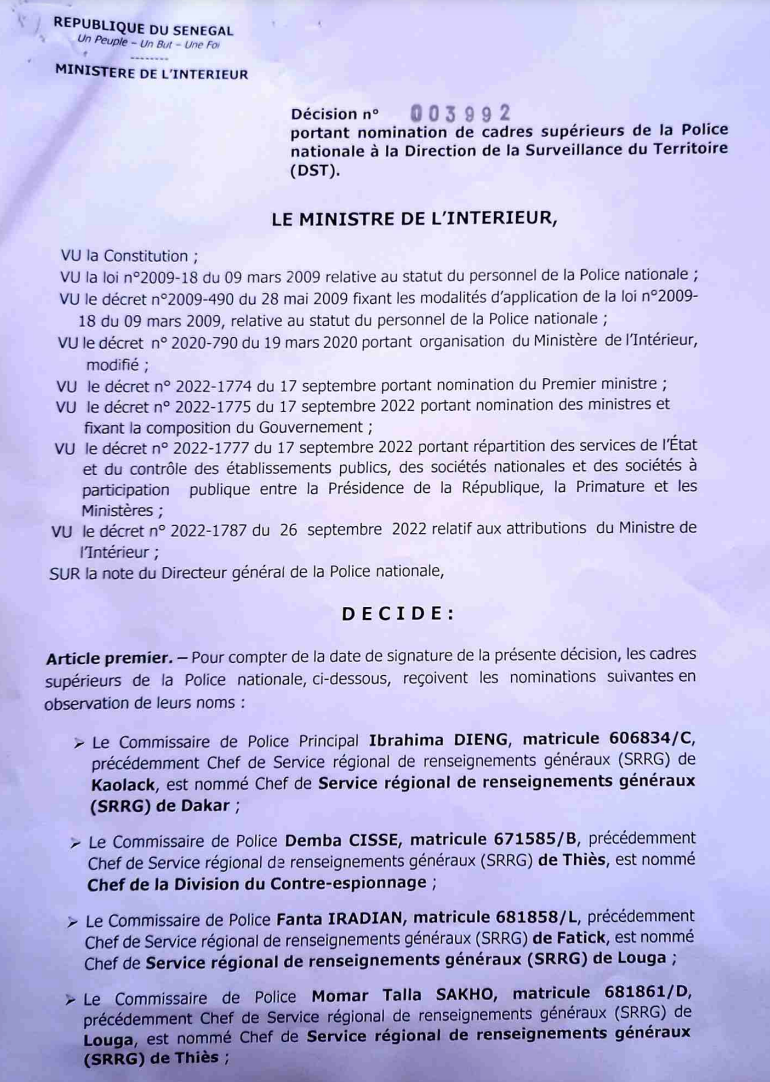 NETTALI.COM - Le ministre de l'Intérieur, Félix Antoine Diome, a procédé à une vaste opération de chamboulement des renseignements généraux. Plusieurs services régionaux ont ainsi changé de patron. Voici l'intégralité des nominations.