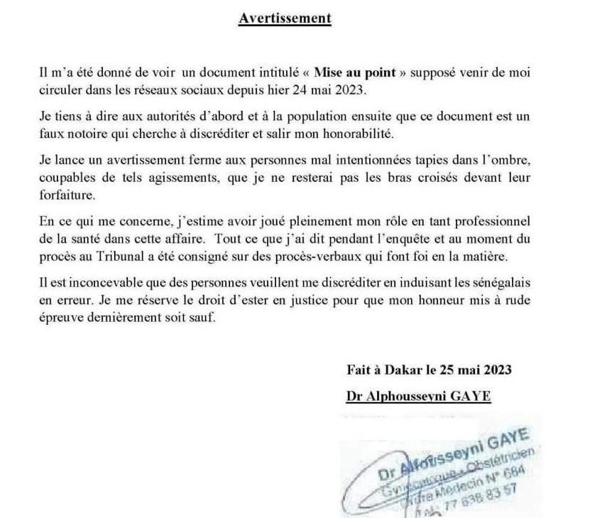 Curieusement, après le tollé créé par "la mise au point", un autre communiqué, intitulé "Avertissement" et attribué au Dr Alfousseyni Gaye, a été rendu public ce jeudi. Il dément la paternité du document publié ce mardi.