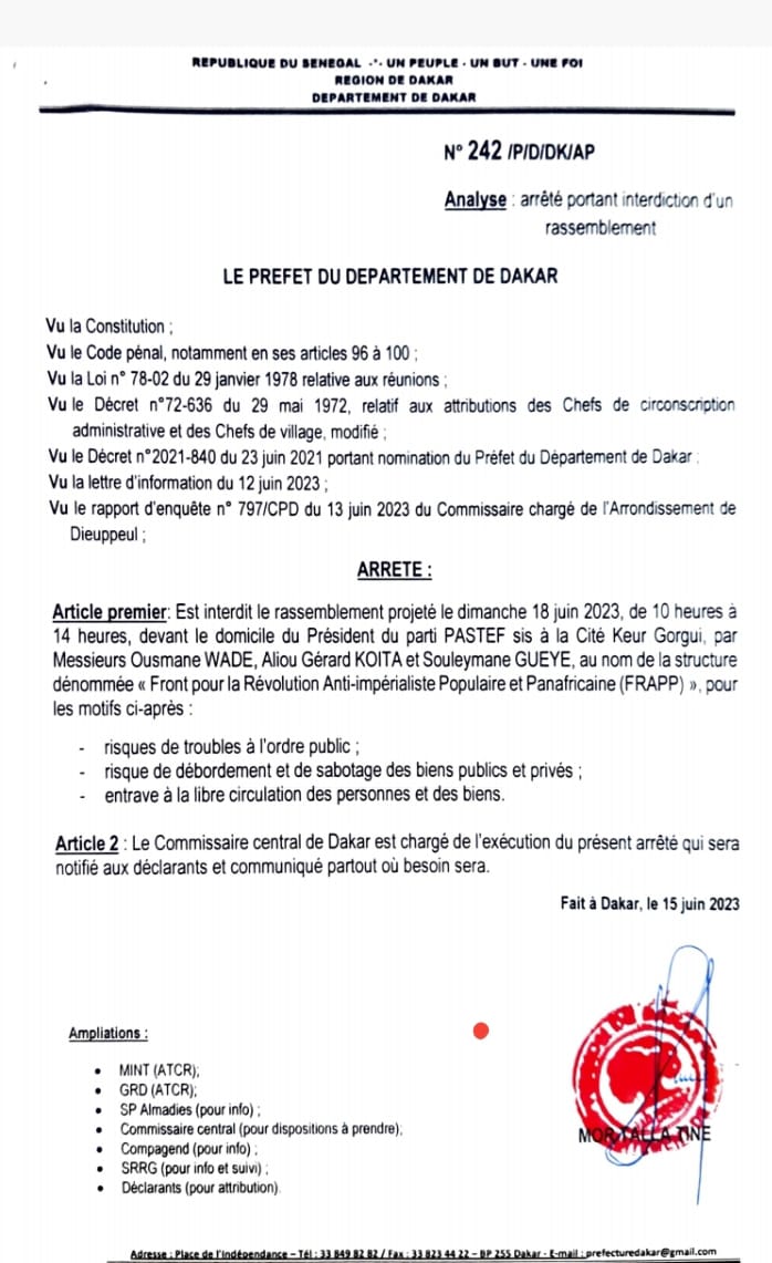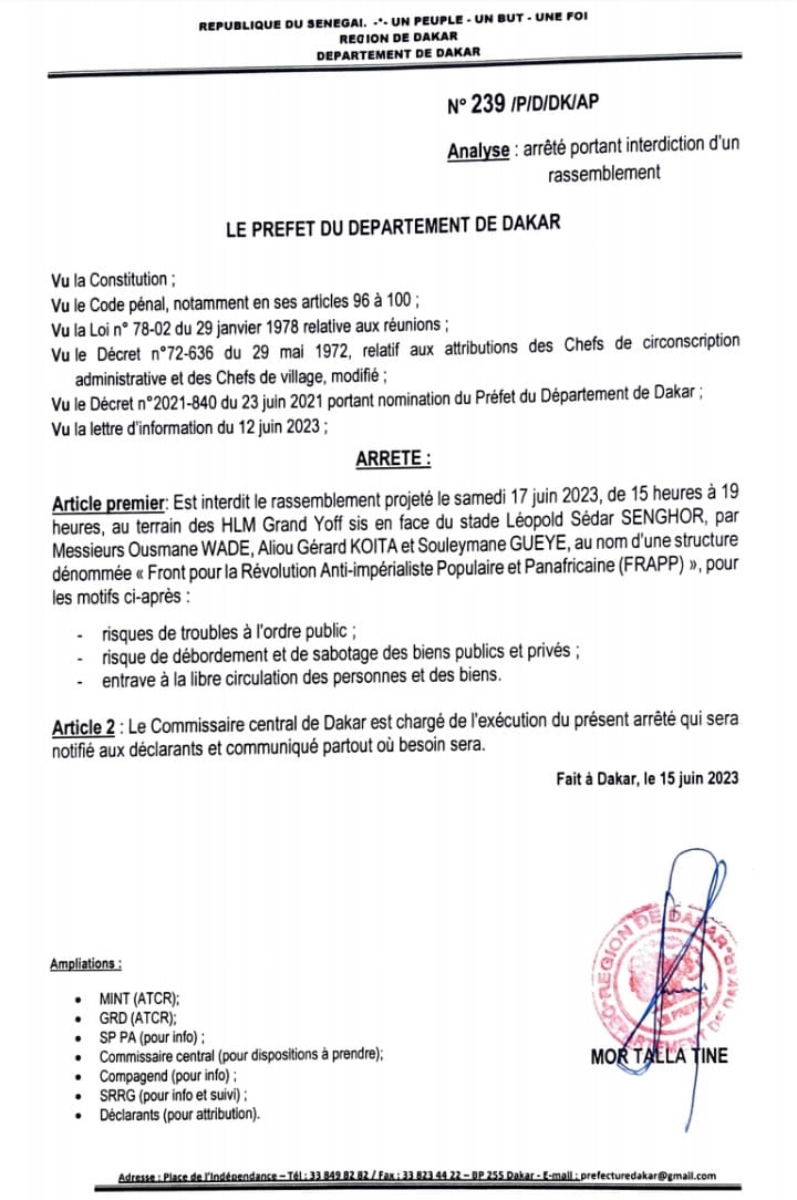 NETTALI.COM- Le préfet de Dakar s’interpose face à la manifestation prévue, le 18 prochain, par le mouvement Frapp devant le domicile d'Ousmane Sonko. L’annonce a été faite par le député Guy Marius Sagna en conférence de presse, ce vendredi, pour dénoncer les interdictions systématiques qui pourraient être source de trouble.
